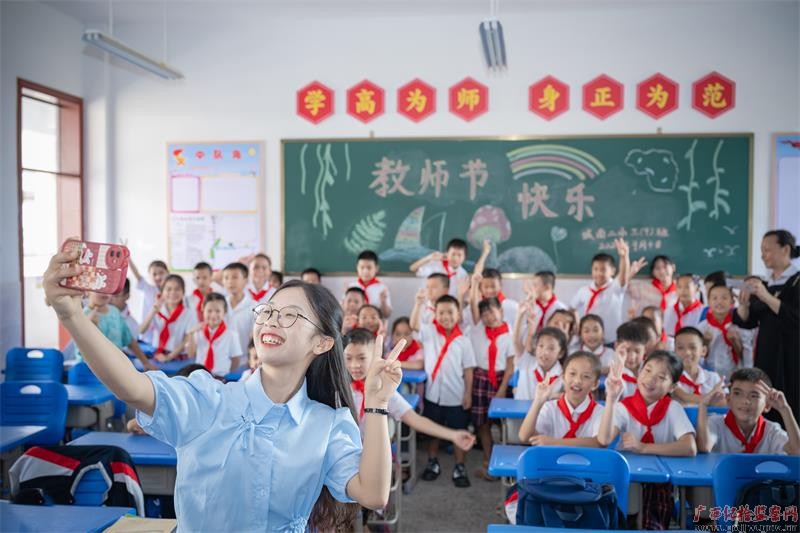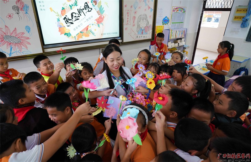 岁月如歌,感念师恩。在庆祝教师节主题活动上,鹿寨县学生们通过诗歌朗诵、主题绘画、制作手工贺卡、录制祝福视频等方式表达对老师的感恩之情。图为该县城南第二小学的老师在学生感恩祝福下和学生开心合影。(鹿寨县纪委监委 潘婷/摄)