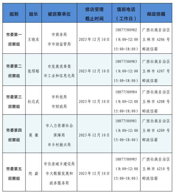 根据巡视工作条例及有关规定,玉林市委巡察组在巡察期间分别设立专门值班电话、邮政信箱,主要受理反映被巡察单位党组织领导班子及其成员、下一级党组织领导班子主要负责人和重要岗位领导干部问题的来信来电来访。其他不属于巡察受理范围的信访问题反映,将按规定由有关部门处理。(玉林市委巡察办)