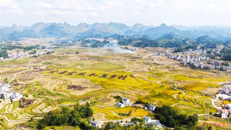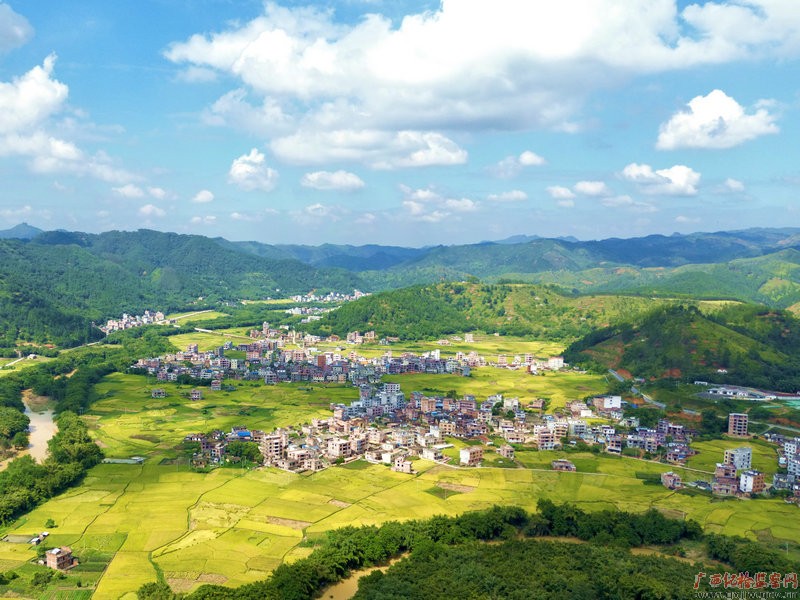金秋十月稻谷香,河池市中、晚稻迎来丰收季,金黄的水稻与房屋相互辉映,形成一道亮丽的风景线。(河池市纪委监委 韦晓/摄)
