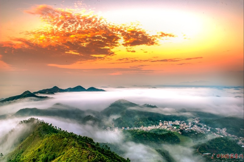 天若火焰山如海,山浪峰涛沐暖阳。远处的天边朝霞如炼,连绵的山峦在云海浮波中时隐时现,眼前的美景犹如一幅美妙的画卷,绚丽多姿,别具风情。(博白县纪委监委 庞勇/摄)