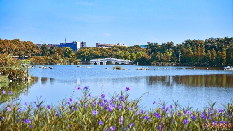 秋日,微风吹动湖面,水光潋滟,近处层层叠叠的是那片紫色花海。一湖、一桥、一花、一木间,北流市会仙河公园描绘出了一幅美不胜收的岭南秋景图。(北流市纪委监委 李家辉/摄)