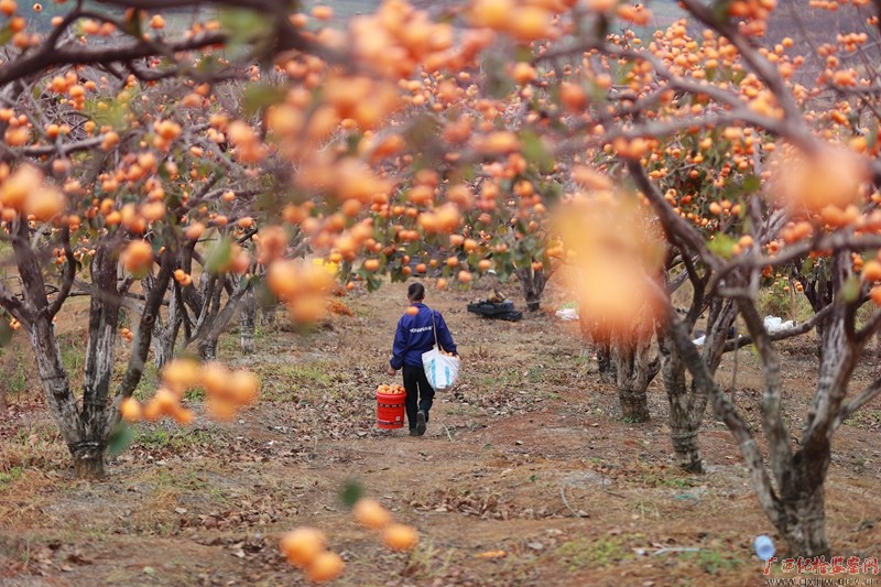 初冬季节,落叶净尽。恭城瑶族自治县恭城镇门楼村门前屋后柿子树上挂着沉甸甸的鲜红柿子,远远望去,嶙峋的枝条上犹如挂满了红灯笼,这一抹红火,用累累硕果呈现出一幅红艳艳的冬日美景。(恭城县纪委监委 周健/摄)