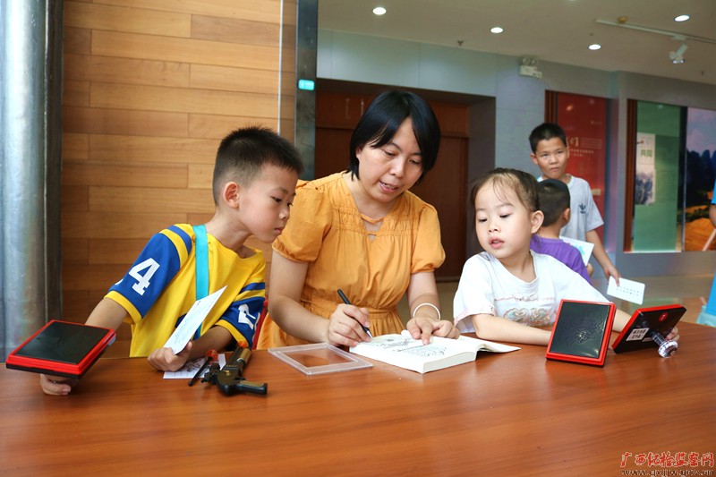 暑假期间,众多孩子走进阳朔县古风博物院,近距离了解中国吉祥文化的发展和历史知识,感受文物魅力。图为孩子们沉浸式体验中华传统文化的艺术魅力。(阳朔县纪委监委 夏立慧/摄)