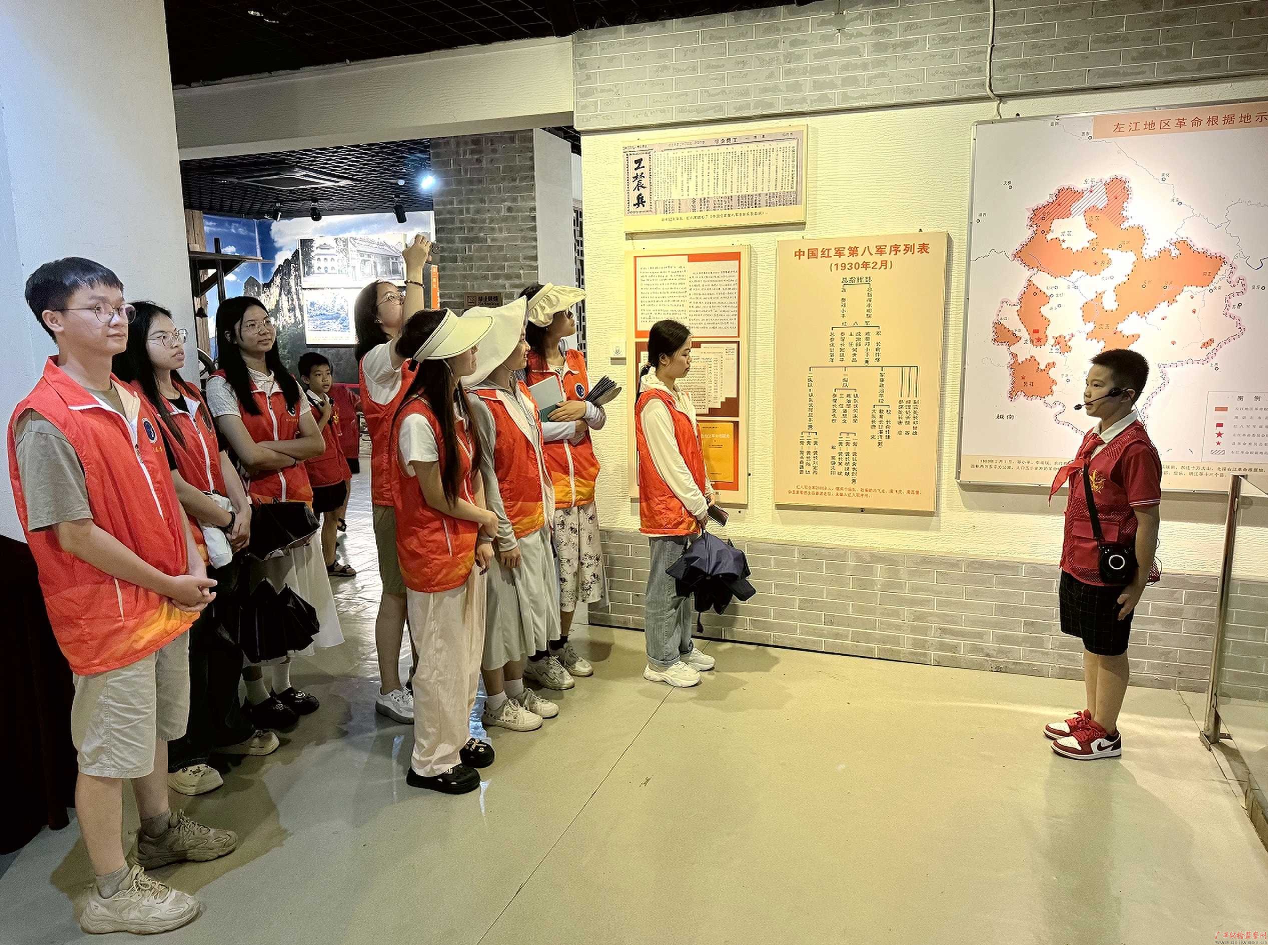 暑假期间,中国红军第八军革命纪念馆利用丰富的红色资源开展“红领巾讲解员”暑期训练营活动,教育引导少年儿童深入了解龙州地方党史、讲好红色故事、宣传家乡文化,争做新时代好少年。图为红领巾讲解员在龙州起义纪念馆为参观游客讲解红八军革命斗争故事。(龙州县纪委监委 农基椿/摄)