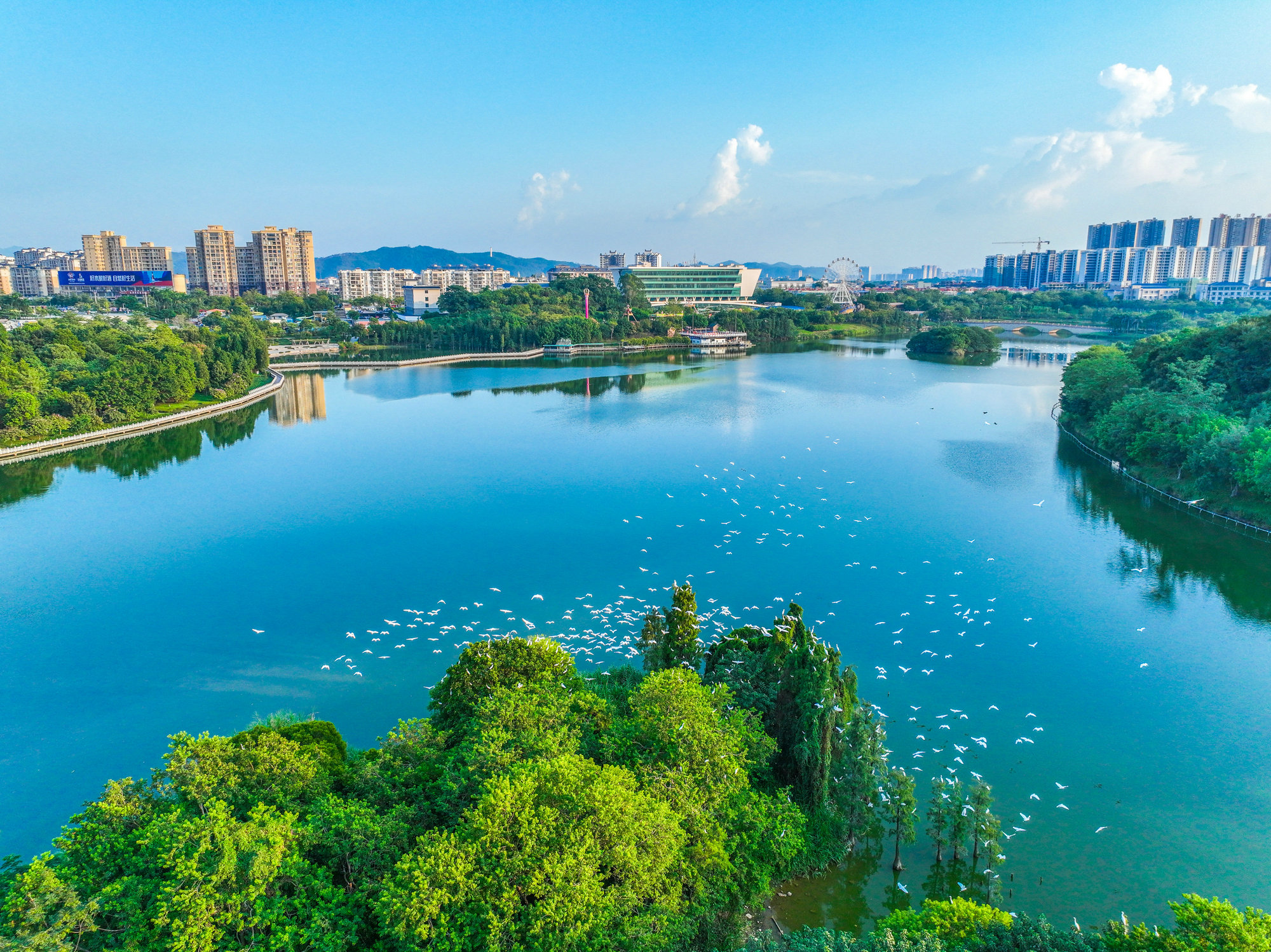 霜降至,白鹭归。连日来,在梧州市玫瑰湖公园,成群到此过冬的白鹭在公园栖息、觅食、嬉戏,形成秋日里的一道美丽风景线。(梧州纪委监委供 林志清/摄)