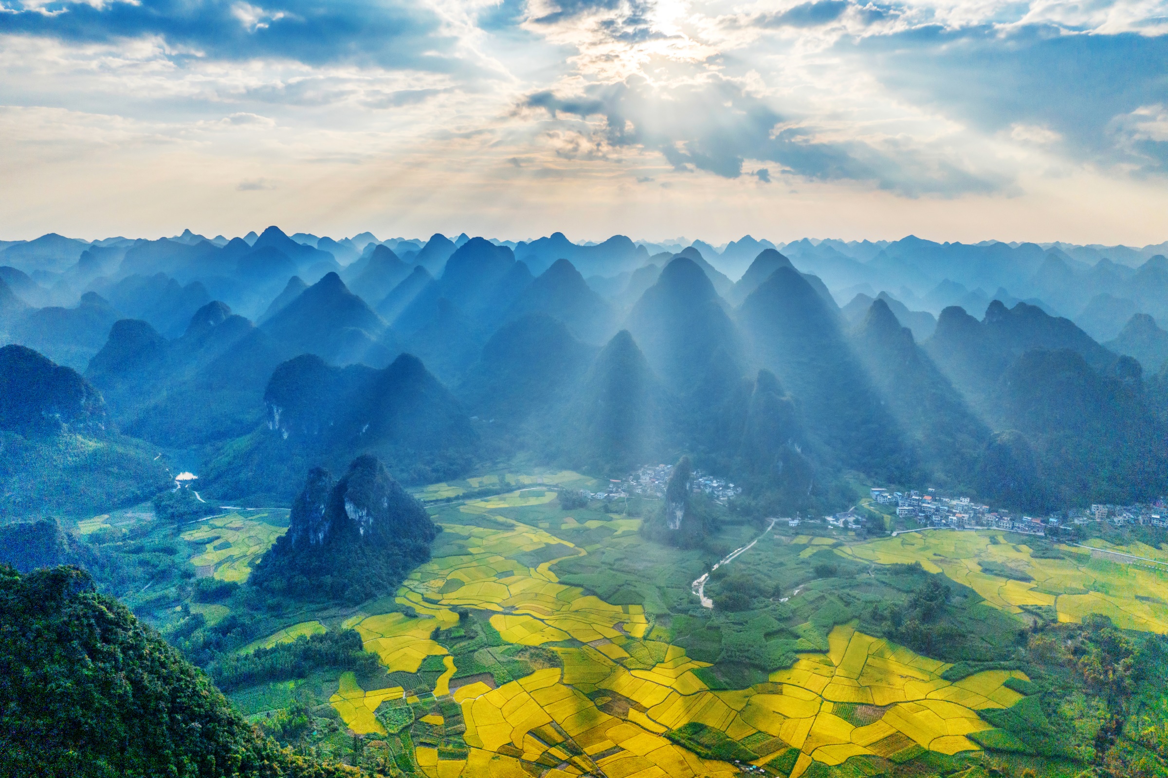 柳州市正兰村的峰林如千军列阵,层叠的黛色山峦间,稻田铺展开明黄的织锦,天光破云洒下金缕,将仙境般的田园画卷晕染得温柔又壮阔。(柳州市柳南区纪委监委供 芦晓峰/摄)