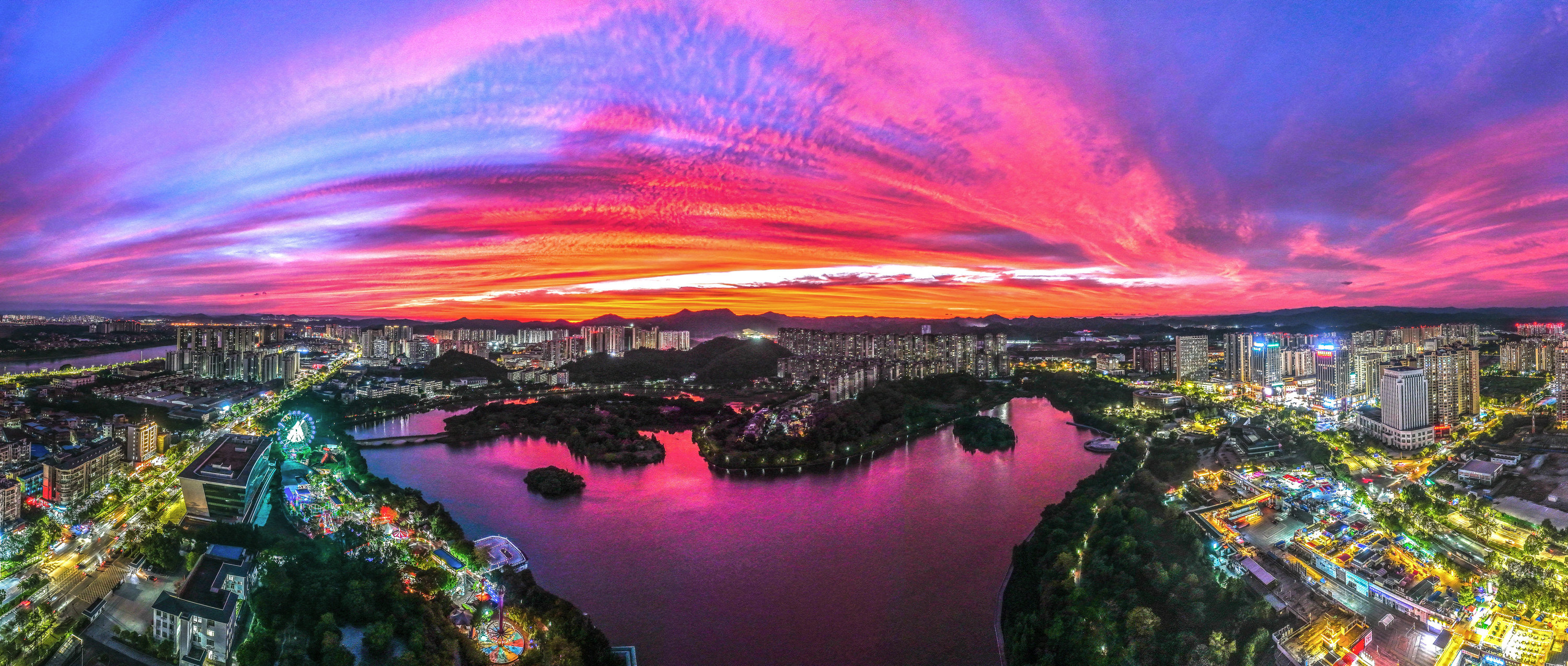 在梧州市玫瑰湖,一场突如其来的美丽晚霞与城市建筑、城市灯光等相映成趣,为初冬城市夜景增添一道美丽景色。(梧州市纪委监委供 林志清/摄)