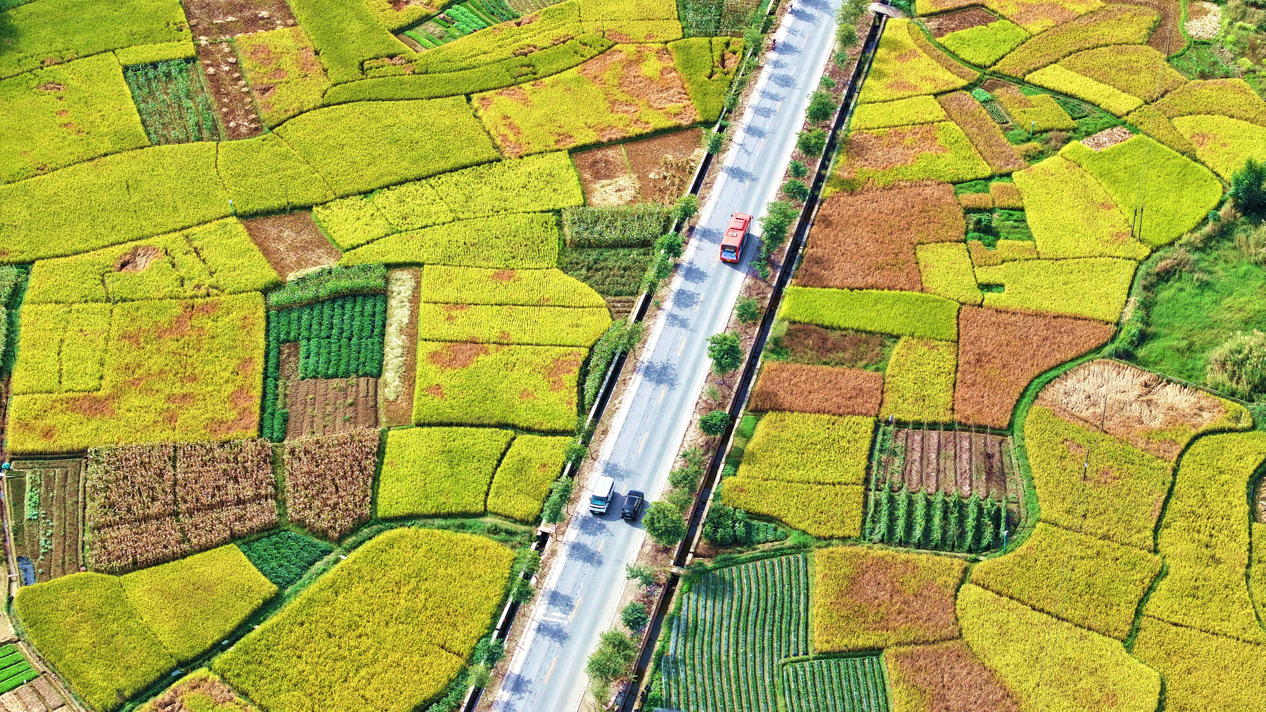 时值初冬,藤县金鸡镇同荣村的道路两旁,稻田如棋盘格般齐整地铺展,金黄的稻穗和翠绿的韭菜织就了色彩斑斓的诗行,在和煦的日光下,洋溢着丰稔的安宁。(藤县纪委监委 谢华婵/摄)