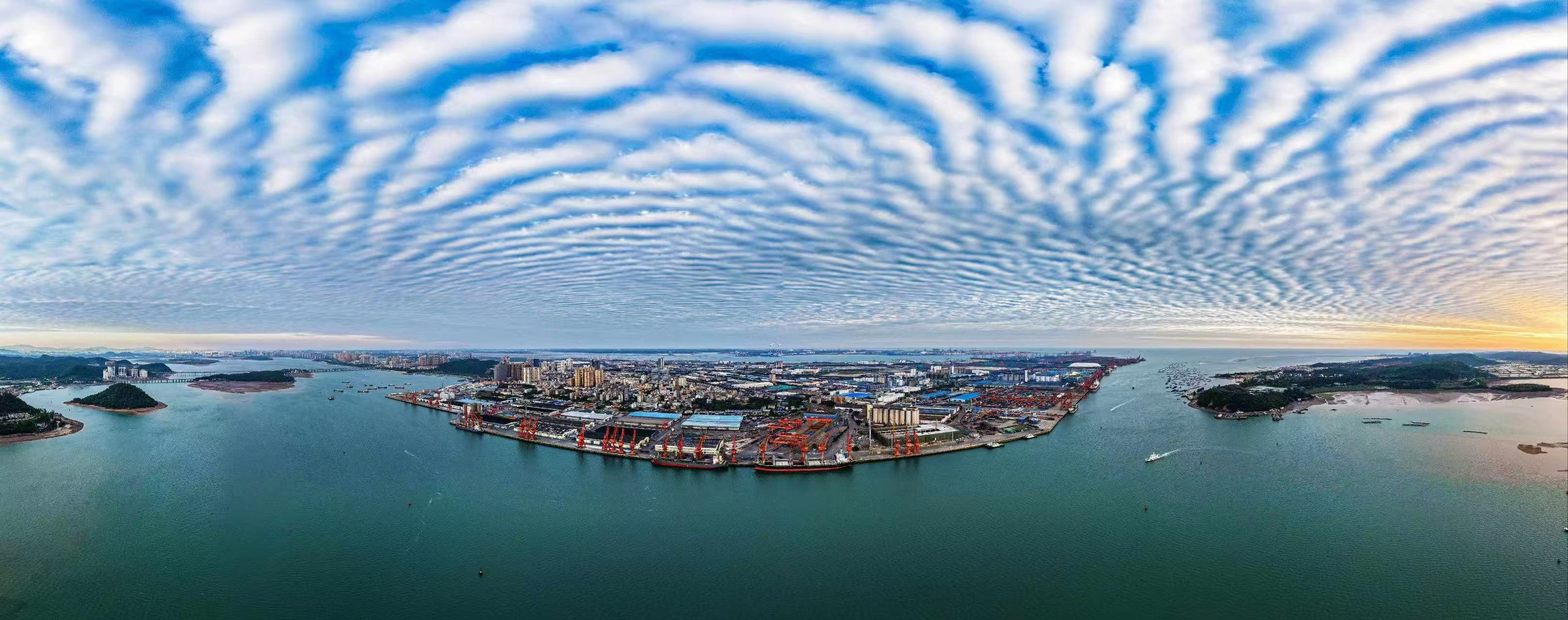 广袤的天空,雪白的云朵层层叠叠,似荡开的水纹涟漪,铺天盖地,在这绝美天幕之下,防城港港口展现出别样的壮美景致,令人叹为观止。(岑溪市纪委监委供 陈耿/摄)