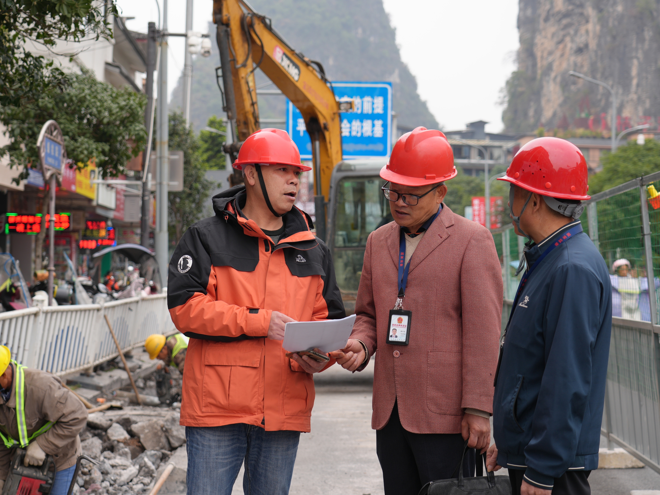 阳朔县纪委监委紧盯工程质量、资金拨付、安全生产等关键环节,强化监督检查,助推项目建设廉洁高效。图为该县纪检监察干部在阳朔镇蟠桃路段供水管网改扩建工程走访了解情况。(阳朔县纪委监委供 徐维薇/摄)