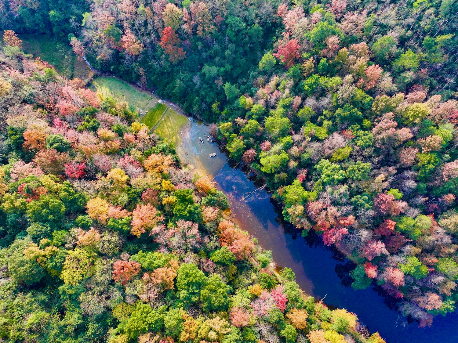 在全州县枧塘镇,五彩斑斓的枫林肆意铺展,于山岗间连绵起伏,宛如天神打翻了调色盘,清溪蜿蜒穿林而过,这幅斑斓画卷,正是大自然对冬日的馈赠。(全州县纪委监委供 唐广东/摄)