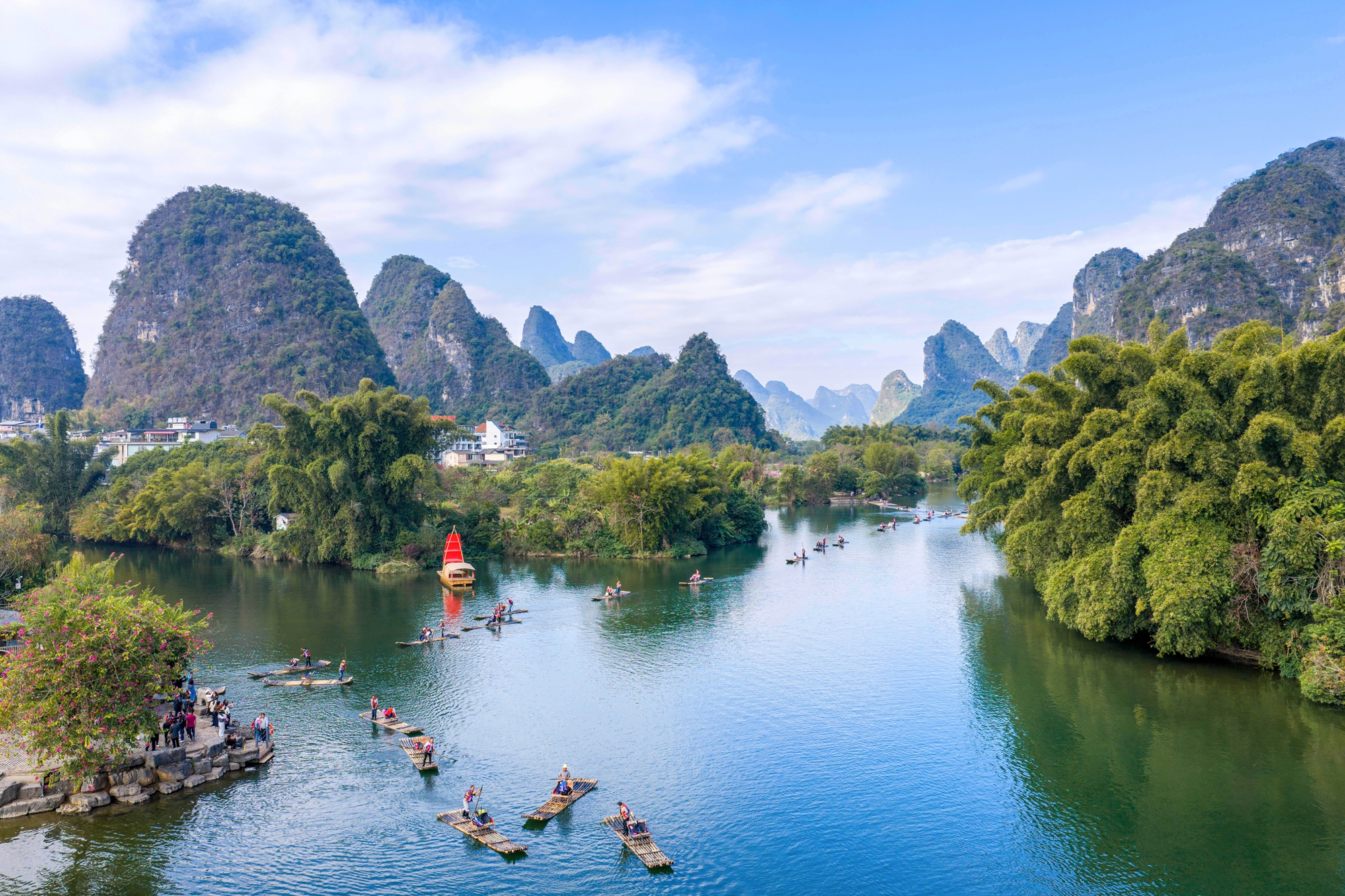 阳朔遇龙河的冬日,充满诗情画意。两岸峰峦叠嶂,凤尾竹褪去了些许绿意,随风摇曳,蓝天白云下屋舍掩映,竹筏轻荡在清幽的河面,宛若流动的山水画卷。(阳朔县纪委监委供 夏立慧/摄)