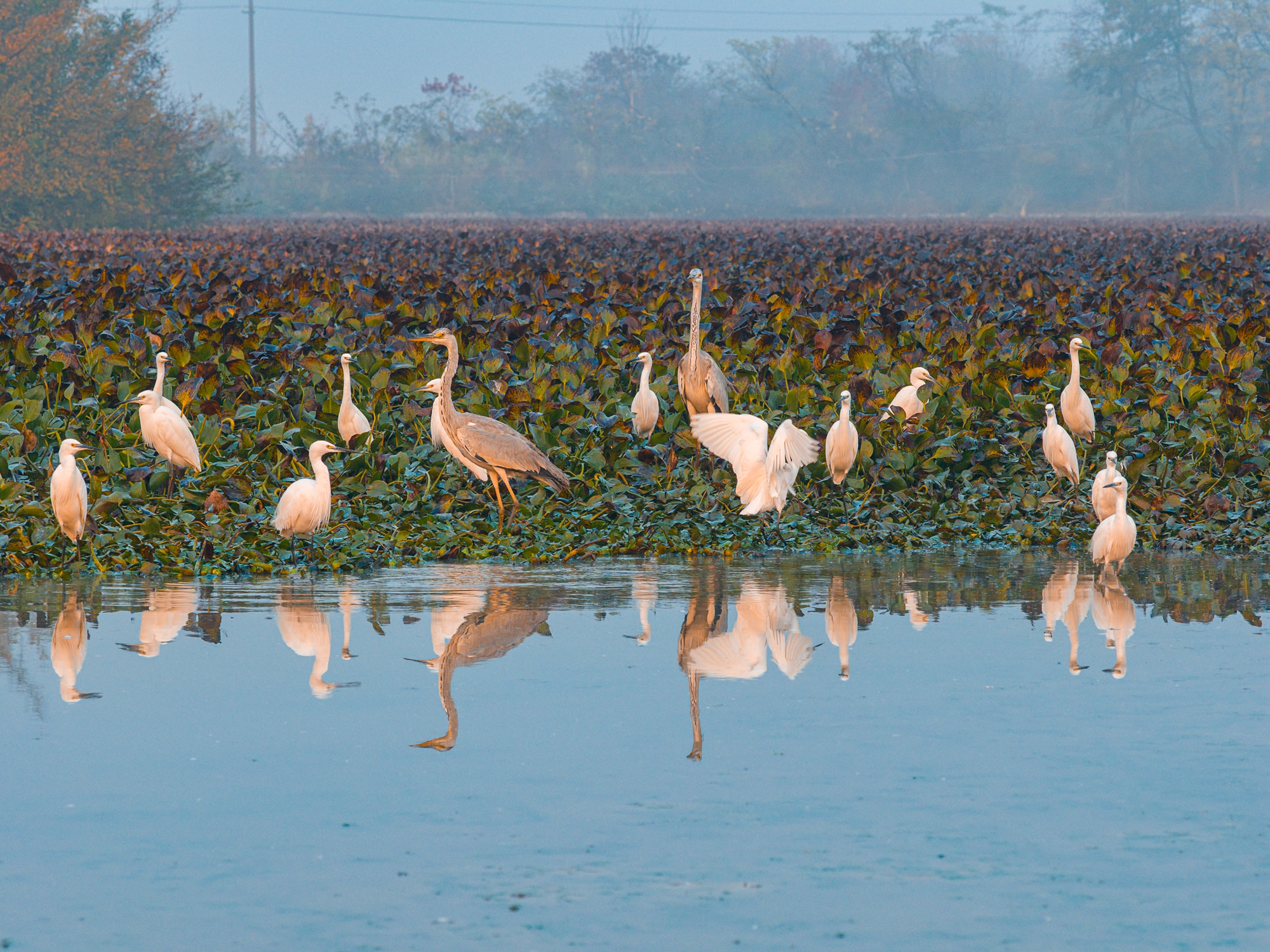 冬日晨雾轻笼,在桂林市临桂区会仙喀斯特国家湿地公园内,群鹭栖于凤眼莲间,白羽映碧水,雾霭衬林丘,绘就南国冬日的灵动画卷。(桂林市纪委监委驻桂林投资集团纪检监察组供 何晏爽/摄)