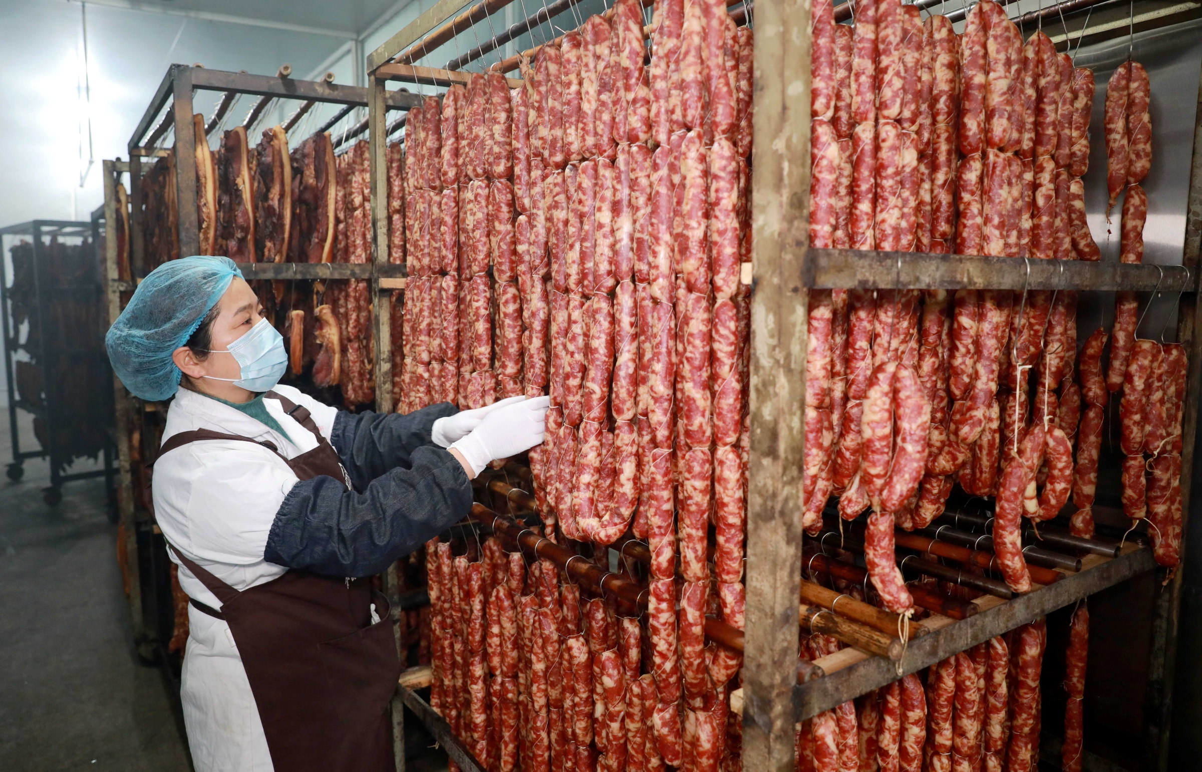 小寒前后,三江侗族自治县斗江镇农产品加工园内一片繁忙景象,工人们正加紧包装腊味产品,全力供应年货市场。(三江侗族自治县纪委监委供 龚普康/摄)