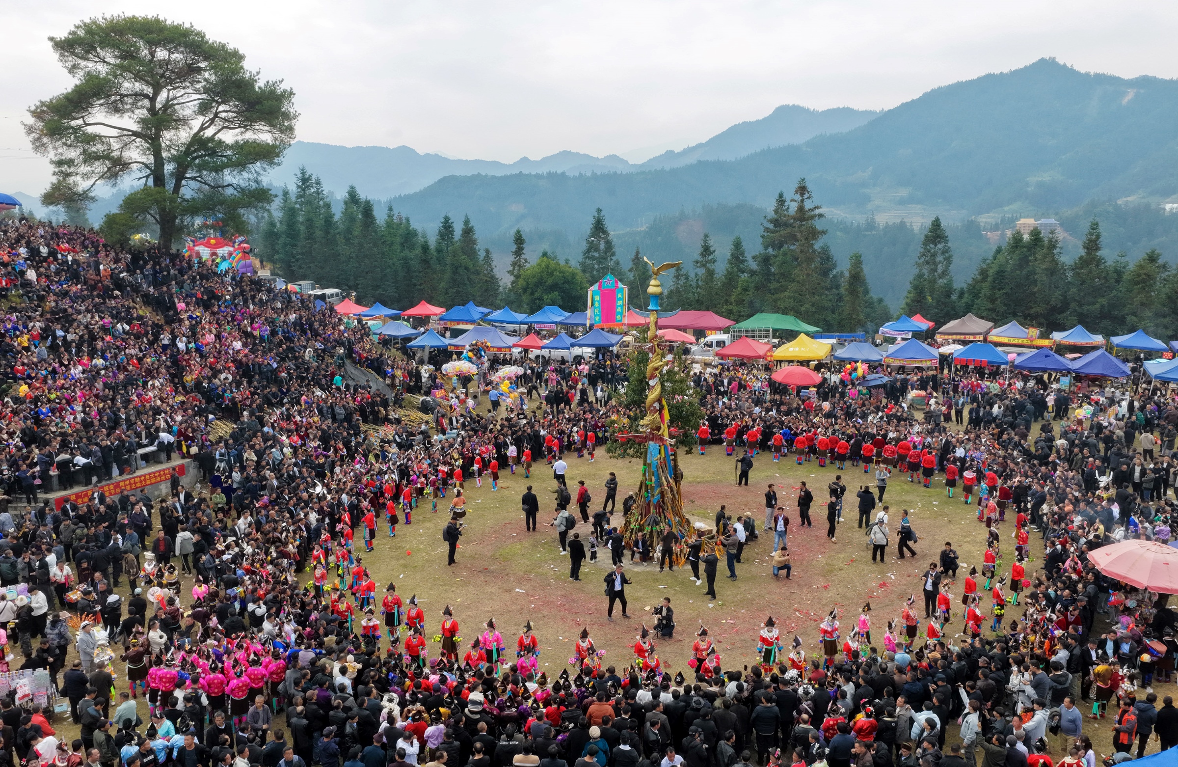 融水苗族自治县大年乡林浪苗寨举行传统垱粉坡会,来自广西、贵州两地的近百支芦笙队上万名苗族、侗族群众和游人,欢聚一堂,跳苗舞、赛芦笙,欢庆节日,喜迎新年。(融水苗族自治县纪委监委 龙林智/摄)