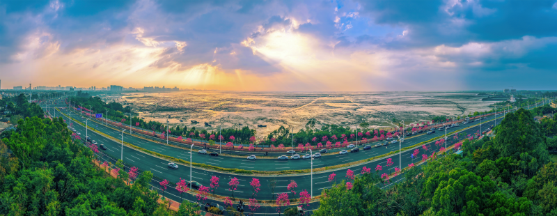 一城春盛,半海潮生。立春时节,北海市廉州湾大道朝阳破云而展,沿途花木繁盛,尽显初春蓬勃朝气。(北海市纪委监委供 毕建东/摄)