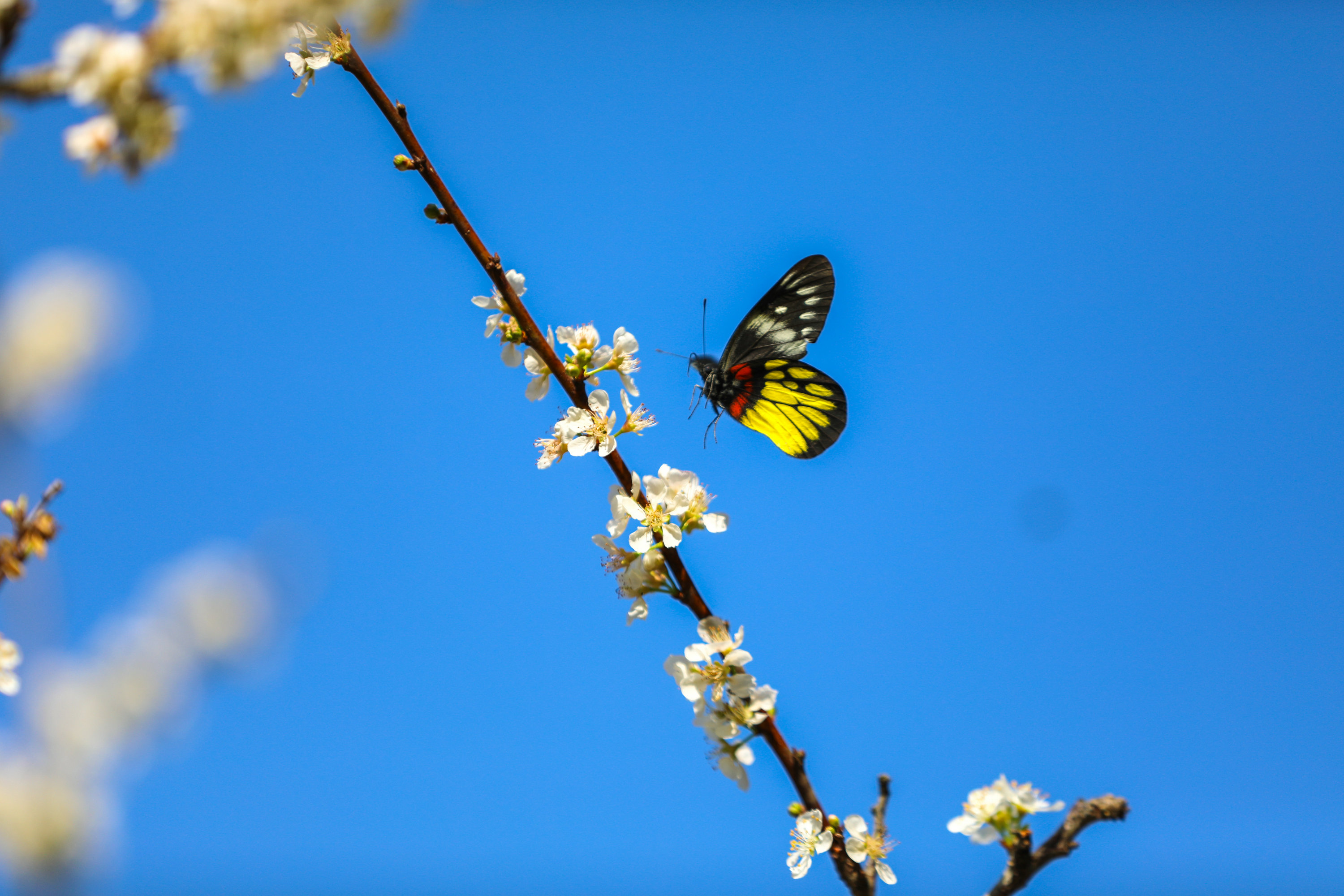 在梧州市万秀区龙湖镇旺步村,成片的李花进入盛花期,一簇簇娇嫩洁白的李花缀满枝头,吸引不少蝴蝶、蜜蜂等到此采蜜、起舞,犹如一幅美丽的闹春图。(梧州市纪委监委供 林志清/摄)