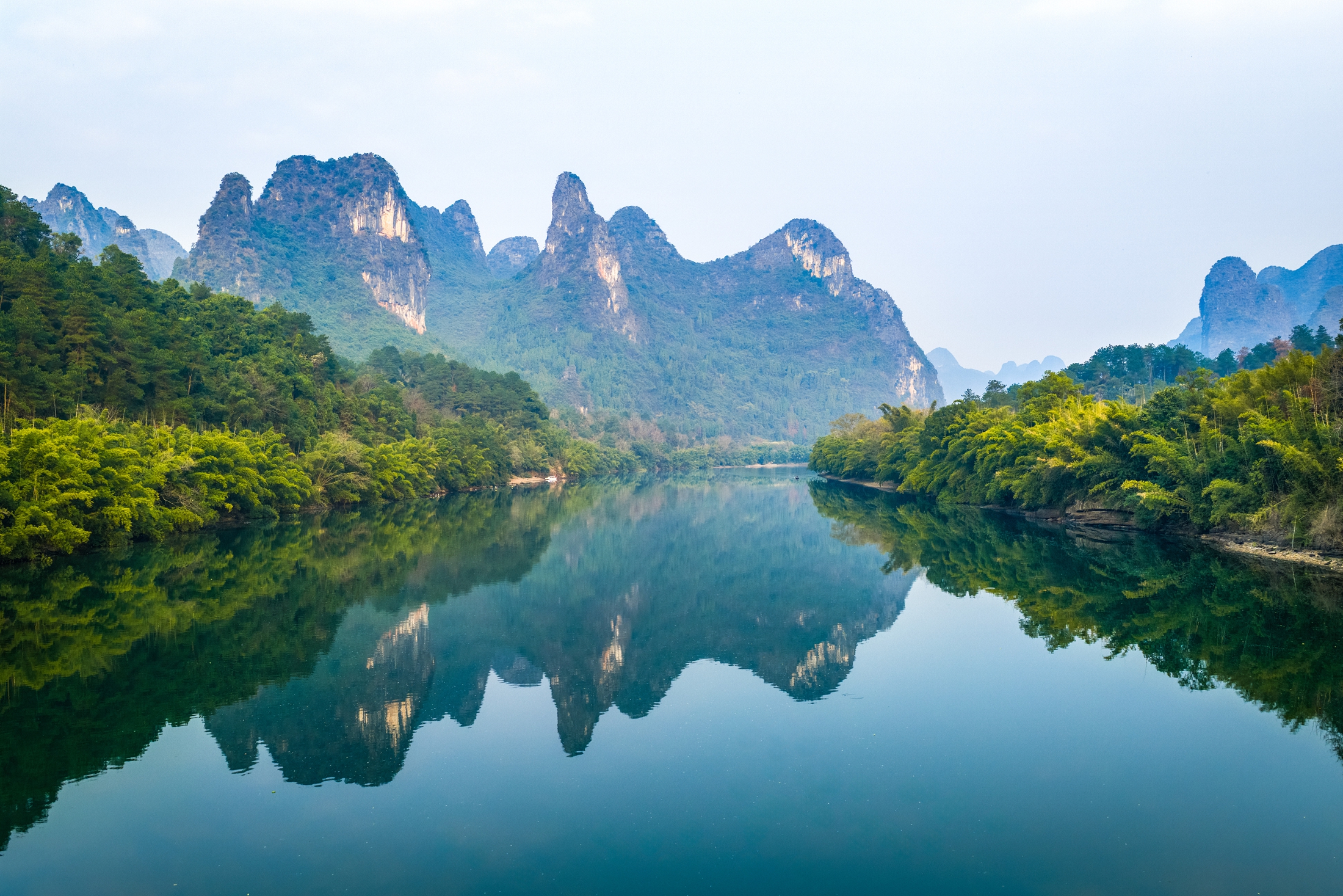 薄雾轻笼漓江峰林,春风催醒竹梢新芽。江水如青绸蜿蜒,倒映叠翠山影,岸畔草芽初萌,恰如水墨初展,满是春的柔嫩生机。(阳朔县纪委监委供 夏立慧/摄)