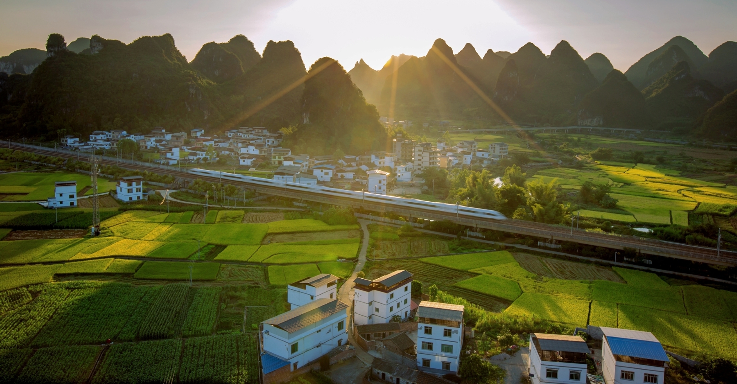 在柳州市鱼峰区白沙镇白沙村马朝屯,初春的暖阳斜斜地洒在山腰上、稻田里,一辆动车从村中央疾驶而过,载着新一年的希望,向春天开去。(柳州市鱼峰区纪委监委供 蔡继青/摄)