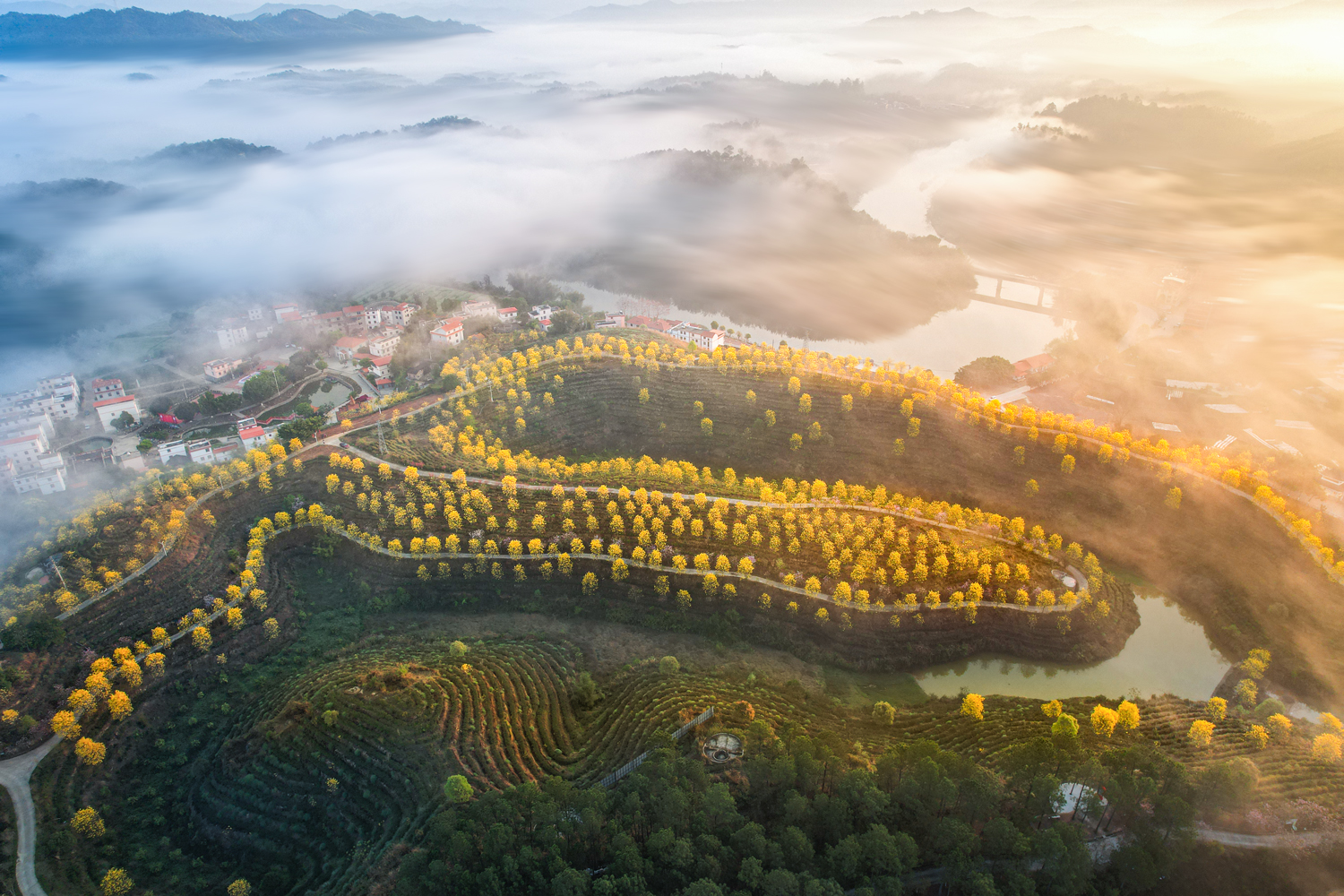 阳春布德泽,万物生光辉。三月壮乡,青山叠翠、碧水含情,木棉傲立、花海漫山。古村与梯田环绕,新城与青山相映,满目皆是盎然春意与蓬勃朝气。
