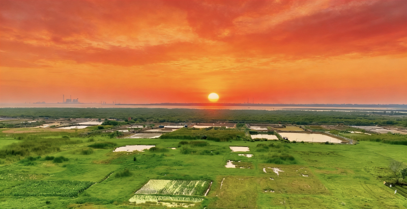 霞光似火染长天,暮春谷雨润田畴。北海市山口镇单兜新村红树林旁,绿野如茵、雨滋百谷的蓬勃生机,在滨海沃野铺展成一幅万物向新的壮美图卷。(北海市纪委监委供 黄艳艳/摄)