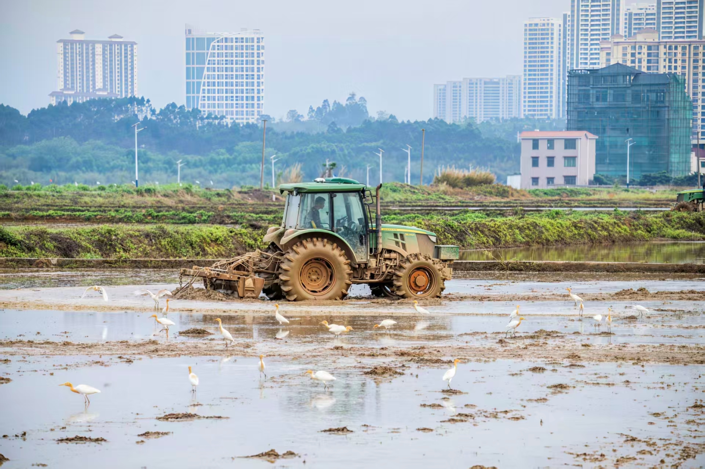 鹿寨县鹿寨镇窑上村,拖拉机在水田中翻整土地,犁开新泥,成群的牛背鹭环绕其间,啄食翻出的虫饵。远处城郭与乡野相映,一派人勤春早、鹭鸟伴耕的生机图景,尽显谷雨 “雨生百谷” 的农忙意趣与生态之美。(鹿寨县纪委监委供 李荣献/摄)