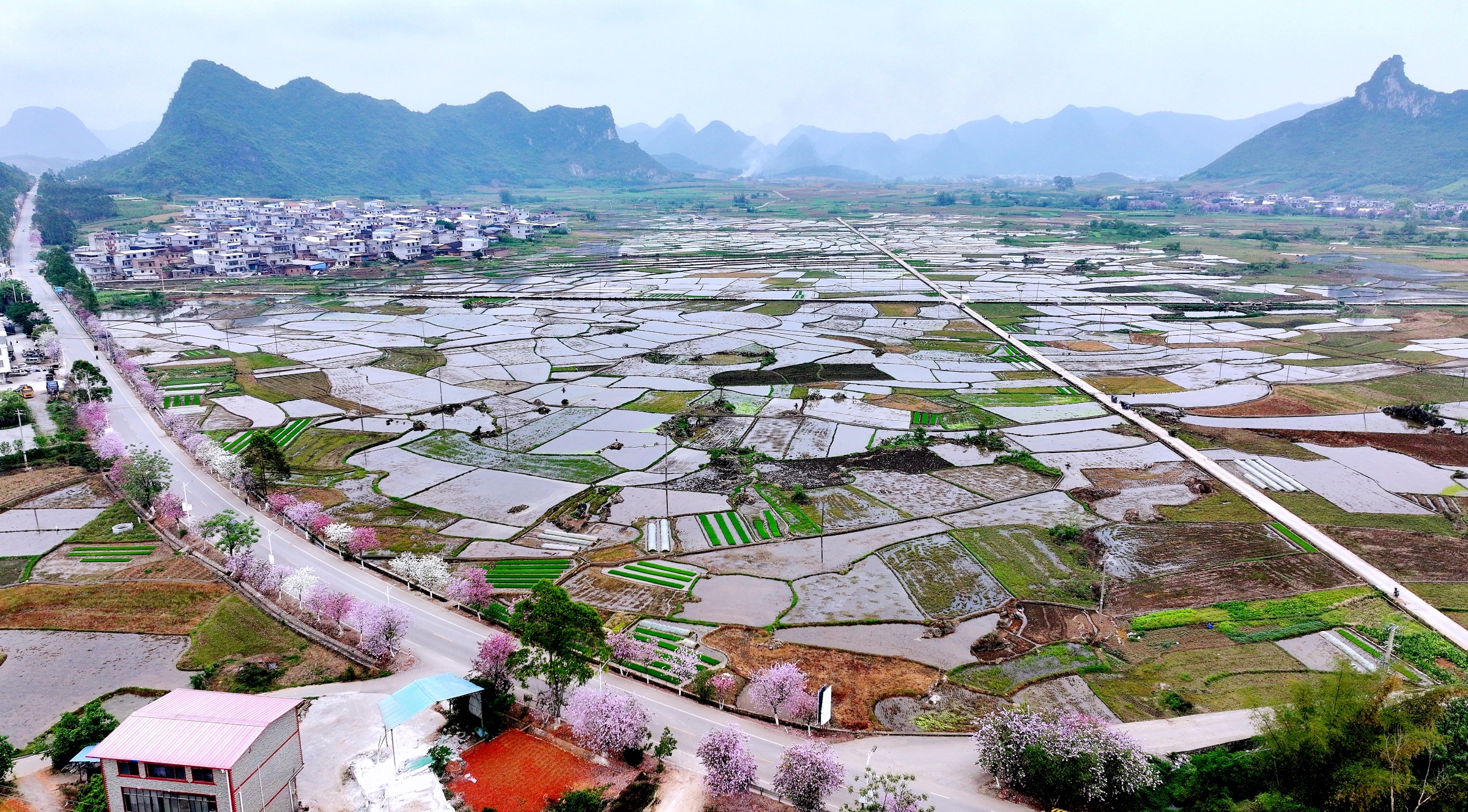 在柳城县马山镇,阡陌交错的稻田与村庄、公路、青山相映成趣,绘就了一幅生机盎然的春日田园画卷。(柳城县纪委监委供 汤晓逵/摄)