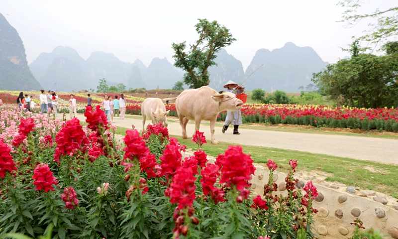 谷雨时节雨水充沛,正是春耕春种的好时节,在崇左市大新县那峒屿湾花田烂漫,耕牛踏香归晚径,荷担农人醉春田。(崇左市纪委监委供 黎卫日/摄)