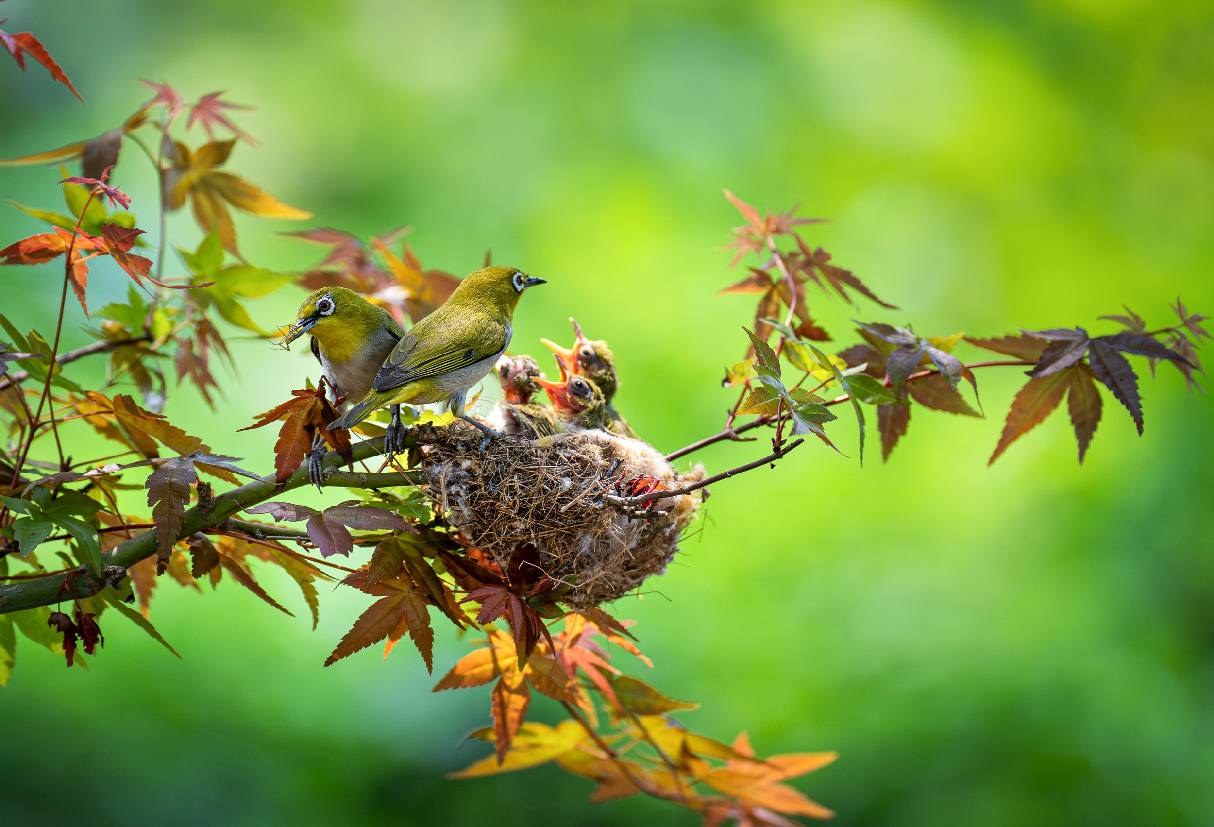 谷雨时节,枫树绽出鲜嫩新叶,鸟巢轻隐叶隙。绣眼鸟衔食归巢哺雏,旋即翩飞复去觅食,雏鸟软啼清婉,在春风里轻轻回荡,满溢春日温情与蓬勃生机。(阳朔县纪委监委供 夏立慧/摄)